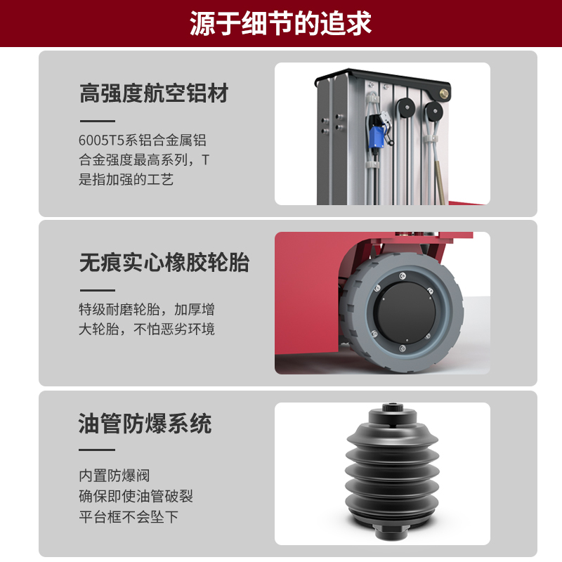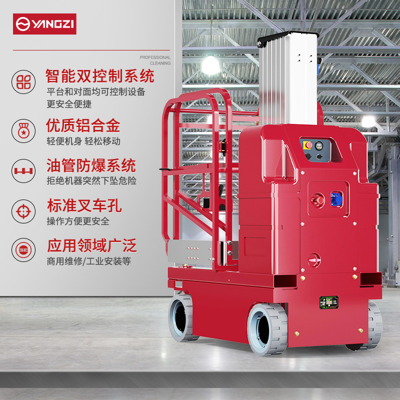 揚(yáng)子升降平臺DZ1:智能雙控系統(tǒng),擁有優(yōu)質(zhì)鋁合金輕便機(jī)身,輕松移動,應(yīng)用領(lǐng)域廣泛,支撐平穩(wěn),還有充電保護(hù),大容量電池組,無痕實心橡膠輪胎,可調(diào)節(jié)自動升降。