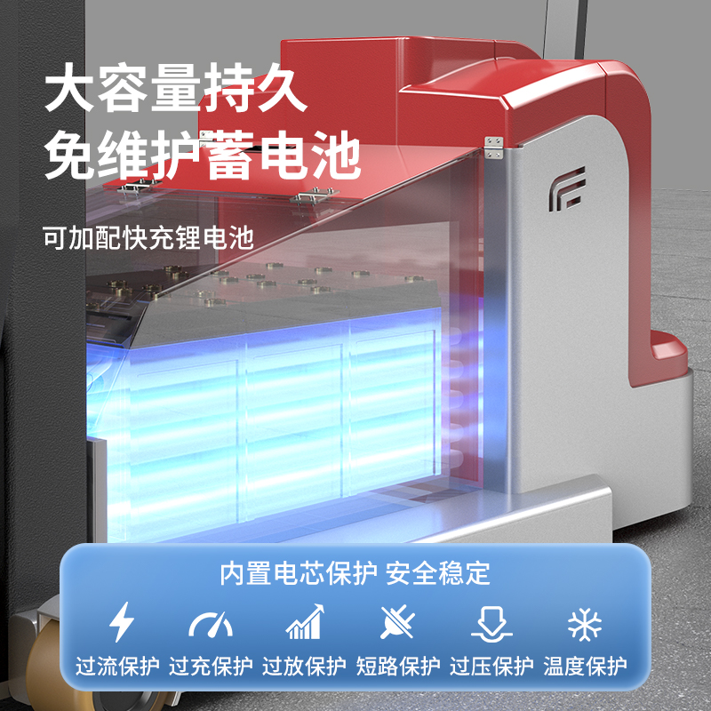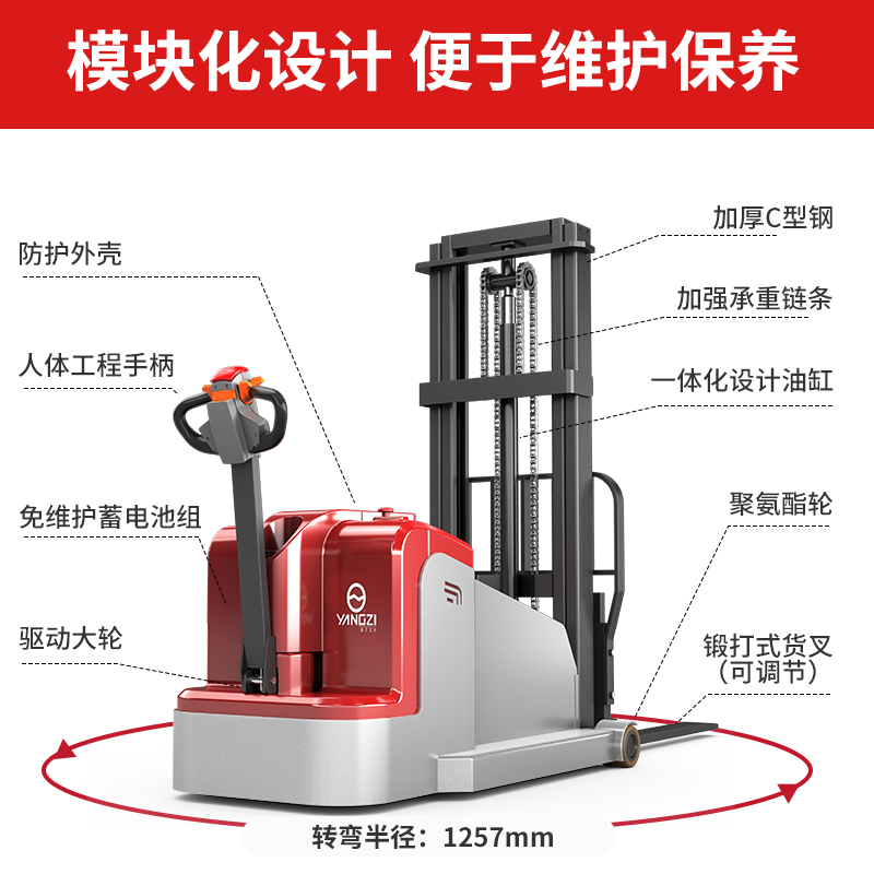 揚(yáng)子堆高車CPDB:精工鍛造有效載荷高,車身輕,強(qiáng)度高,穩(wěn)定性能好,一體鑄造油缸,載荷更大杜絕漏油。還有手動緩降控制閥門,采用高性能免維護(hù)電池組
