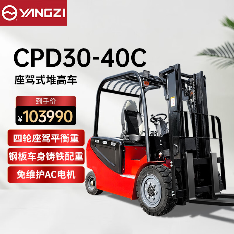 揚(yáng)子電動(dòng)叉車CPD30-40C 四輪座駕式叉車3噸升高4米,采用汽車操控方式,多功能顯示屏,鋼板車身